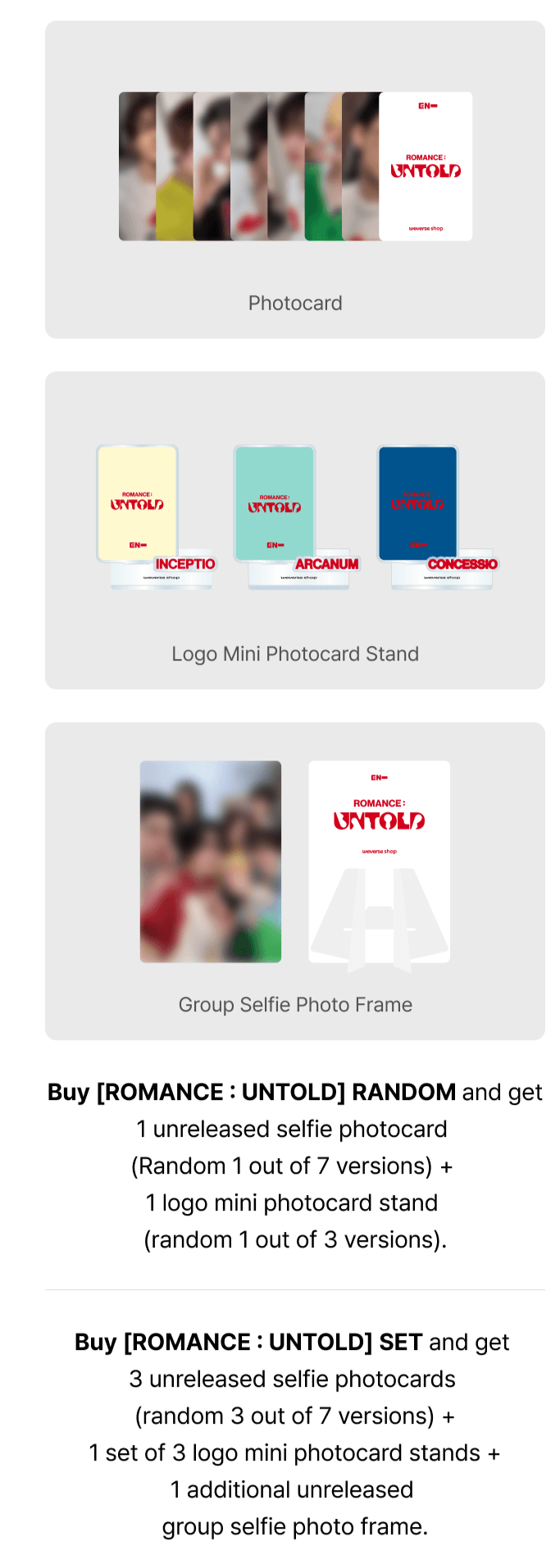 ENGENE ver. (Set) 1 set of 7 types of unreleased selfie photo cards + 1 set of 7 types of card skin + 1 type of album case exclusively for ROMANCE: UNTOLD (ENGENE ver.)